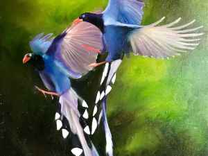I often depict goddess-like figures that resemble my own reflection, weaving personal myth with universal feminine archetypes. Birds and elements of the natural world appear as sacred messengers—guides that carry the energy of freedom, transformation, and grace.